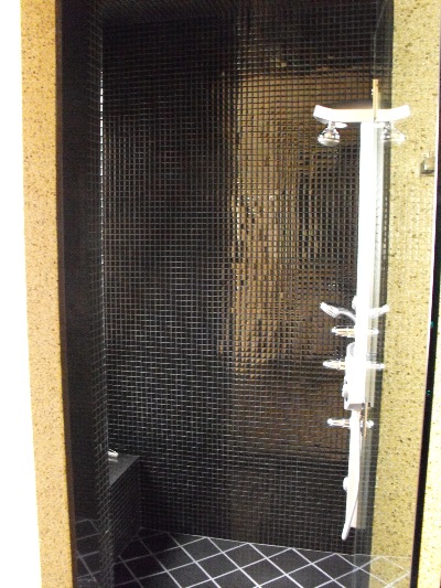 1x1 black glass tile with cut down 12x12 granite floor slab seat and jams.