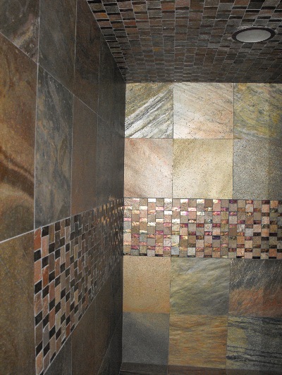 Steam room in iridescent slate with cut down slate and glass mosaic.