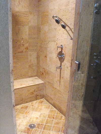 Master shower 12x12 granite tile with slab seat and jams.